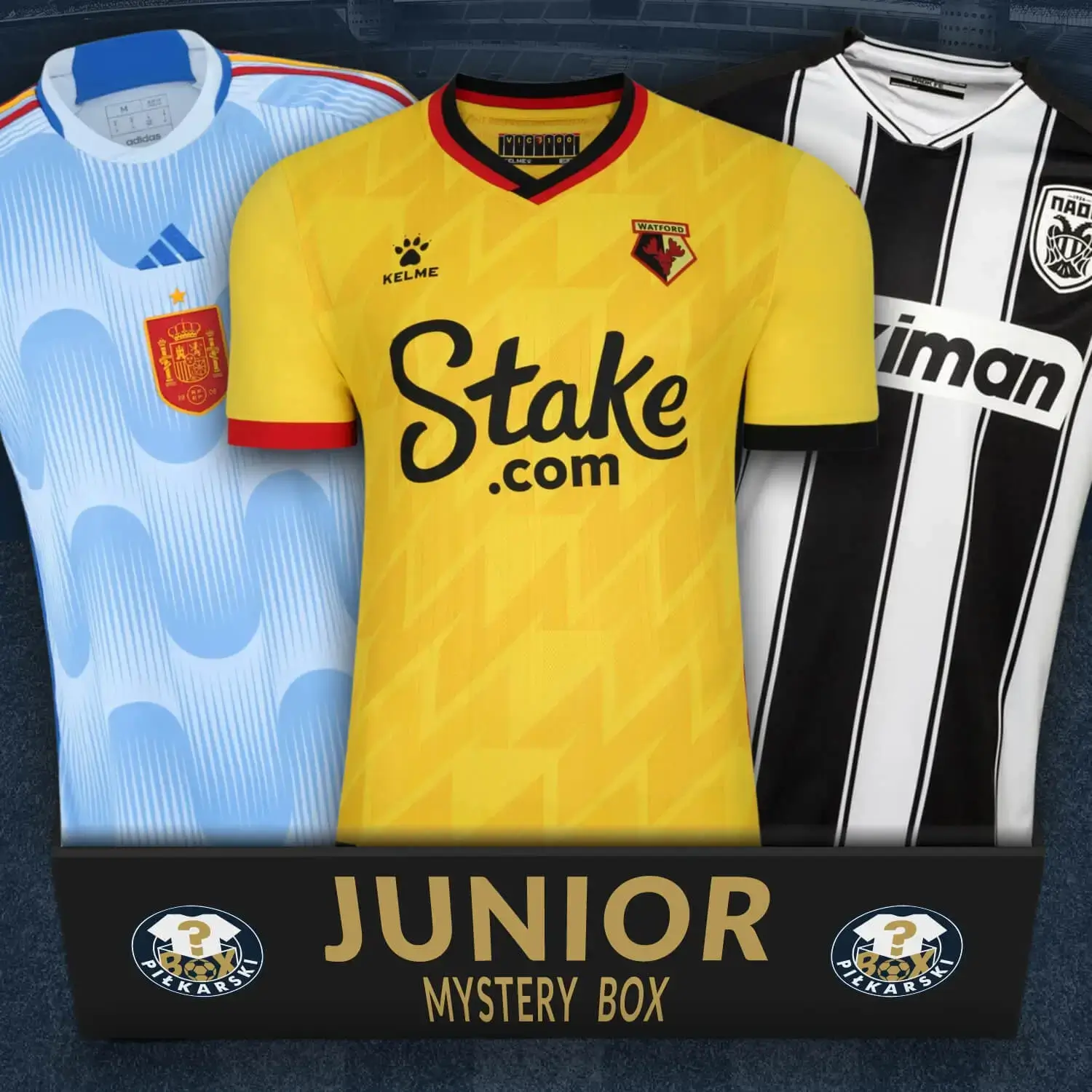 Koszulki piłkarskie Watford żółta, PAOK FC czarno-biała, reprezentacja Hiszpanii błękitnaJUNIOR MYSTERY BOX